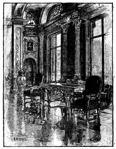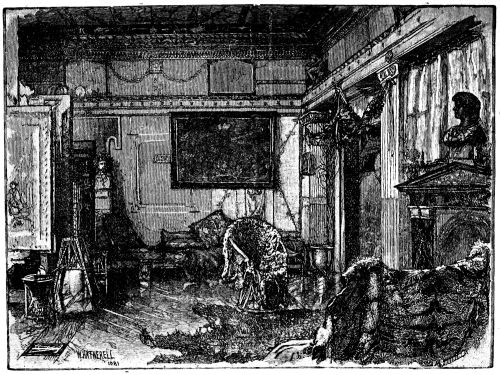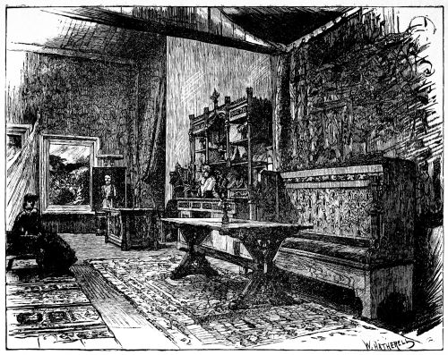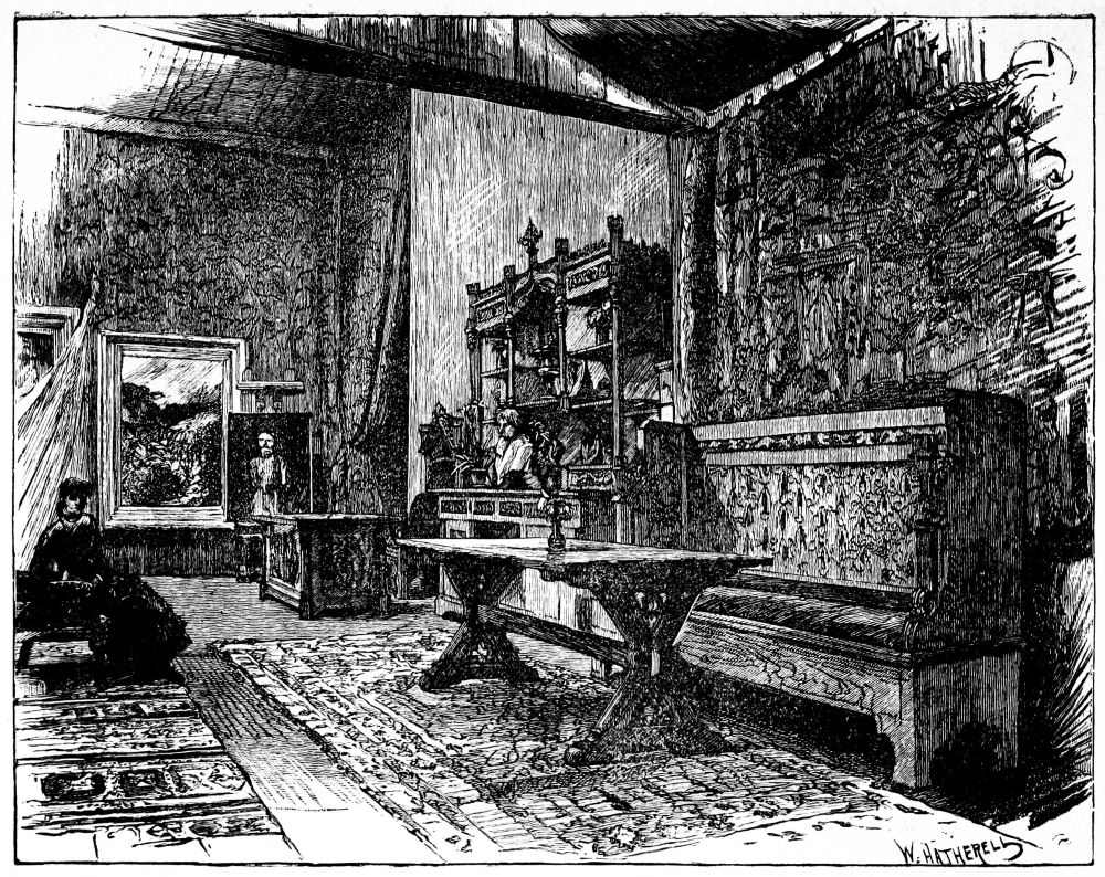 [30] Many years ago the town was excited by the description of a room which that clever, erratic artist, Mr. Whistler, had designed and painted for a gentleman of fortune, Mr. Neyland. It was known as “the Peacock Room,” and is all painted in blues and gold, after the pattern of tints in the peacock’s tail. The dado is blue on a gold ground, and above it the scheme is reversed, being gold on a blue ground. This rich and gorgeous arrangement is now, probably enough, somewhat faded.