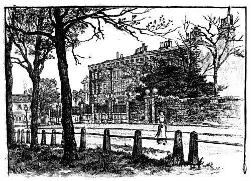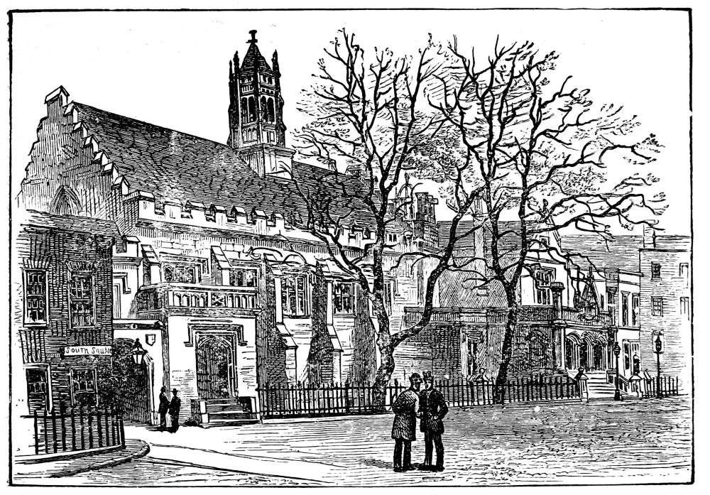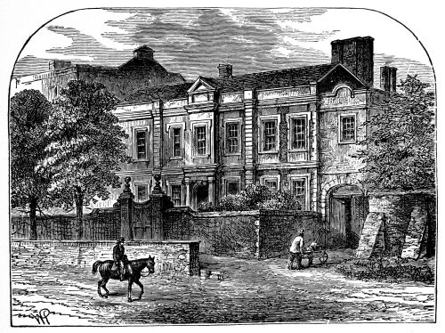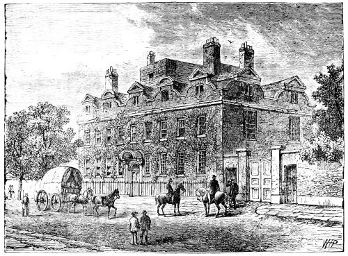 Retracing our steps and crossing Victoria Street by “The Stores,” we pass into Rochester Row. Near the Westminster end we come to a large old house of a delightful pattern, with vast inclosed gardens or grounds behind. This is the “Grey Coat” School, with its fine tiled roof, central block, and wings. Nothing can be better than the rare solid brick-work and the air of solidity and comfort. Some directing Goths have, however, erected a barbarous sort of colonnade or passage exactly before the door of entrance, thus spoiling the effect of the façade. Everything is in excellent keeping, even to the high substantial wall round it. But the fair expanse of ground behind is coveted, and already a slice has been taken off for a large factory.