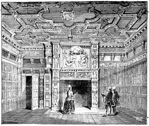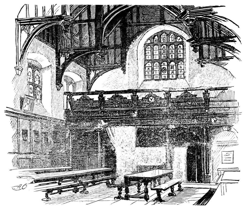 It is evening at Christmas-tide as we come to the Sanctuary—quaint name for the open space in front of the Abbey—the traffic seems at its very busiest. The Aquarium hard by is getting ready for a busy night; its electric arc lights are blazing. Beyond, the fierce light at the top of the Clock Tower gives token of busy work within, for a so-called “autumn session” is going on. Everything betokens din, bustle, and hard work. Passing under the archway we are in “Dean’s Yard,” and what a sudden change! It almost seems a monastic inclosure. The moon is at the full; the noise of the streets is suddenly hushed. Here are the old-fashioned buildings, low and antique, with the entrance to the Cloisters of the Abbey. The chimes from the Clock Tower are giving out eight. Here, too, is the Dean’s House, quaint, low and spreading, with a deceptive air of ruin, mullioned windows, and the Canons’ residences beside it; the Head Master’s house, too, all such as would be found in a Cathedral Close. Here are small peaked windows, the walls bearing a look of rust and ruin, but very sound. Passing through a dilapidated little archway, we reach the square, where on the left is made out Ashburnham House, lost in shadow; but its elegant iron gate is distinct enough; while in front there is the old-fashioned and heavy irregular buildings of the Westminster School, with its old-fashioned porch and steps, and straggling doorways. A crowd of persons are entering—the youths, fine lads, stand about in their caps and gowns. We pass up some cramped stairs and find ourselves in the great dormitory, with alcoves on each side, while overhead are seen the beams of the sloping platform which support the spectators’ seats. For in this vast hall the performance is given.