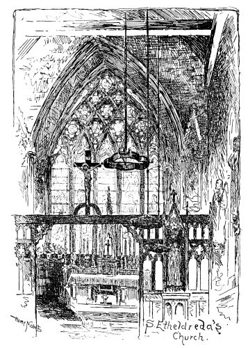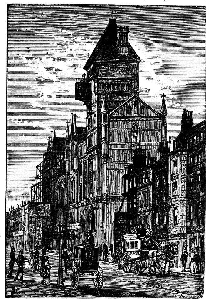 A few years ago there was a cluster of mean and squalid streets on the ground where the Aquarium stands—with others of the Seven Dials pattern leading to it. These have been cleared away with extraordinary rapidity, and quite a new quarter has been formed, of which the Town Hall is the centre. Not unpleasing, and effective also, is the large group of buildings in irregular broken order that gather round it. There is Christ Church and churchyard, across which a path has been made from Victoria Street, and which is flanked by the new and grand “Iddesleigh Mansions,” with its stained glass and outside galleries. Then on the other side rise the enormous “St. Ermine’s Mansions,” rival to the “Queen Anne’s.” The visitor should note the extraordinary decorations over the doorways—two boys seated in a dégagé attitude, their legs projecting airily, projections not likely to remain long in situ. We should note, however, the pleasing Vicarage just erected in the churchyard, a compact and snug and picturesque little edifice. The church is rude and bald enough, but a project is on foot for completing the steeple. Then the place will be complete. Yet, strange to say, fringing these pretentious edifices, meant for the opulent, are the most squalid dens and alleys filled with cellars and “shanties,” with such significant names as{12} King’s Head Court, Smith’s Rents, Horse Shoe Alley, and the like, where poverty reeks and flourishes well, as it might be said, and where from half a crown to four shillings is paid weekly for some crazy dilapidated chamber.
