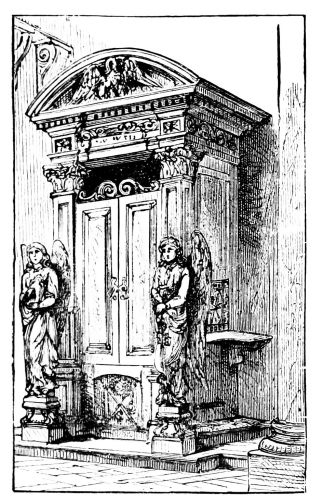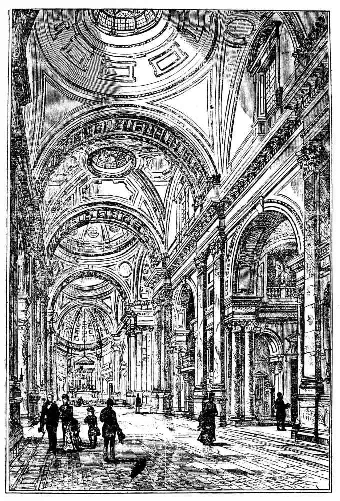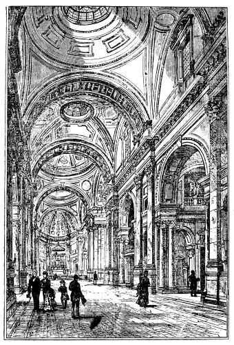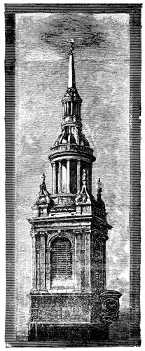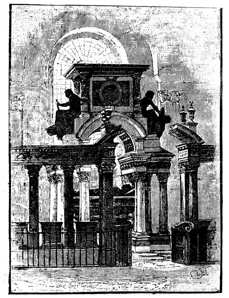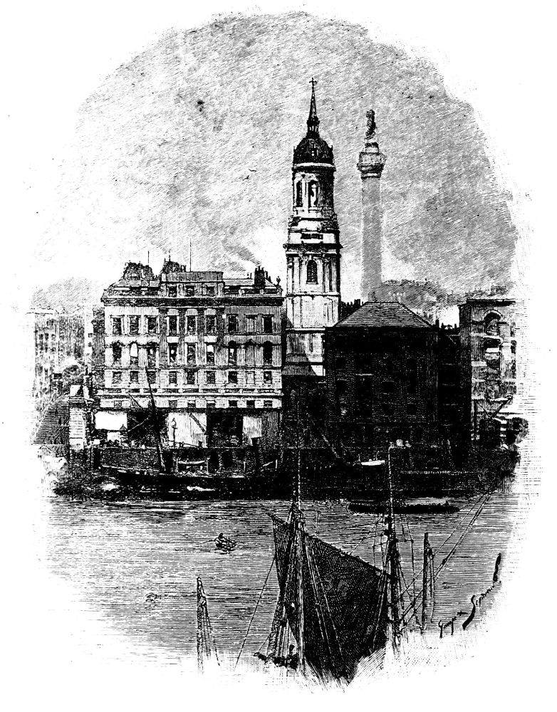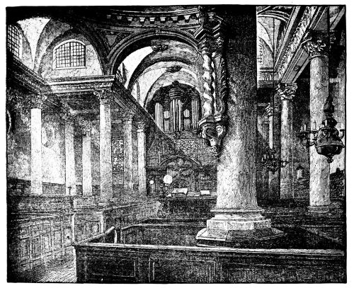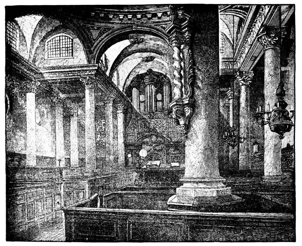 [22] It was thus that passing by St. Magnus’s on one Sunday afternoon, the door open, the organ pealing out, we expected the usual “Sunday service” in the City, with its dozen or so of congregation—the few old women, the sleeping old men, who had turned in for the purpose. Who could have thought of realizing so perfectly the traditional Swift story of “Dearly Beloved Roger”? For there was literally the minister and his clerk, reading and responding, the pew-opener sitting by the door, and not a soul besides! The pew-opener rose, making a piteously imploring, despairing appeal to remain; the incumbent glanced over, half-ashamed—but the intruder fled!