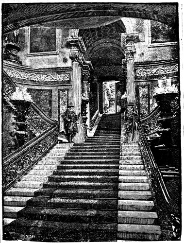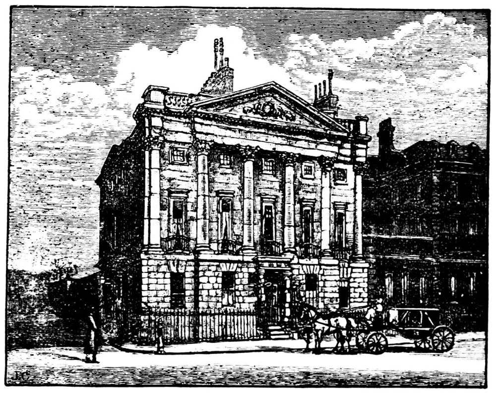[15] It was sold “in lots” in 1882 for about £10,000; the grand marble staircase, which cost £11,000, went to Madame Tussaud’s for £1,000, where a portion may be seen. The massive gilt grille, or railing that faced the street, cost £3,500, and was bought for Sandown for 300 guineas. Being all levelled and cleared the ground was laid out and sold, when it was found there was room for seventy-five houses.