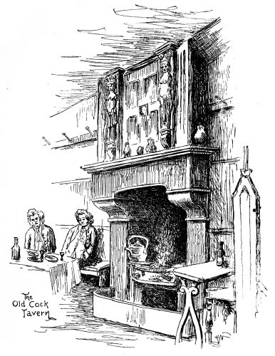 [18] “The fate of the Cock Tavern was decided yesterday, when a special jury at the Recorder’s Court in the Guildhall awarded £9,000 for the freehold, and nearly £11,000 to the lessee and occupier, in all about £20,000. It was proved that the profits were £2,000 a year. A casual visitor would have great difficulty in believing the fact. The ancient dinner haunt was a small, dingy snuggery, greasy with the steam of fifty thousand dinners. It hardly seated a score guests, and served nothing but steaks, chops, and kidneys with ale and stout for liquor. Counsel for the lessee, in addressing the court on the amount of award, said he had himself seen only that day three of Her Majesty’s judges at luncheon hour in the neighbouring law court sitting over their chop and pewter of London stout in The Cock. The only articles reserved in the old place are the mantelpiece, a massive work in oak, of the time of James I., and the sign of the house, which was carved by Grinling Gibbons.”