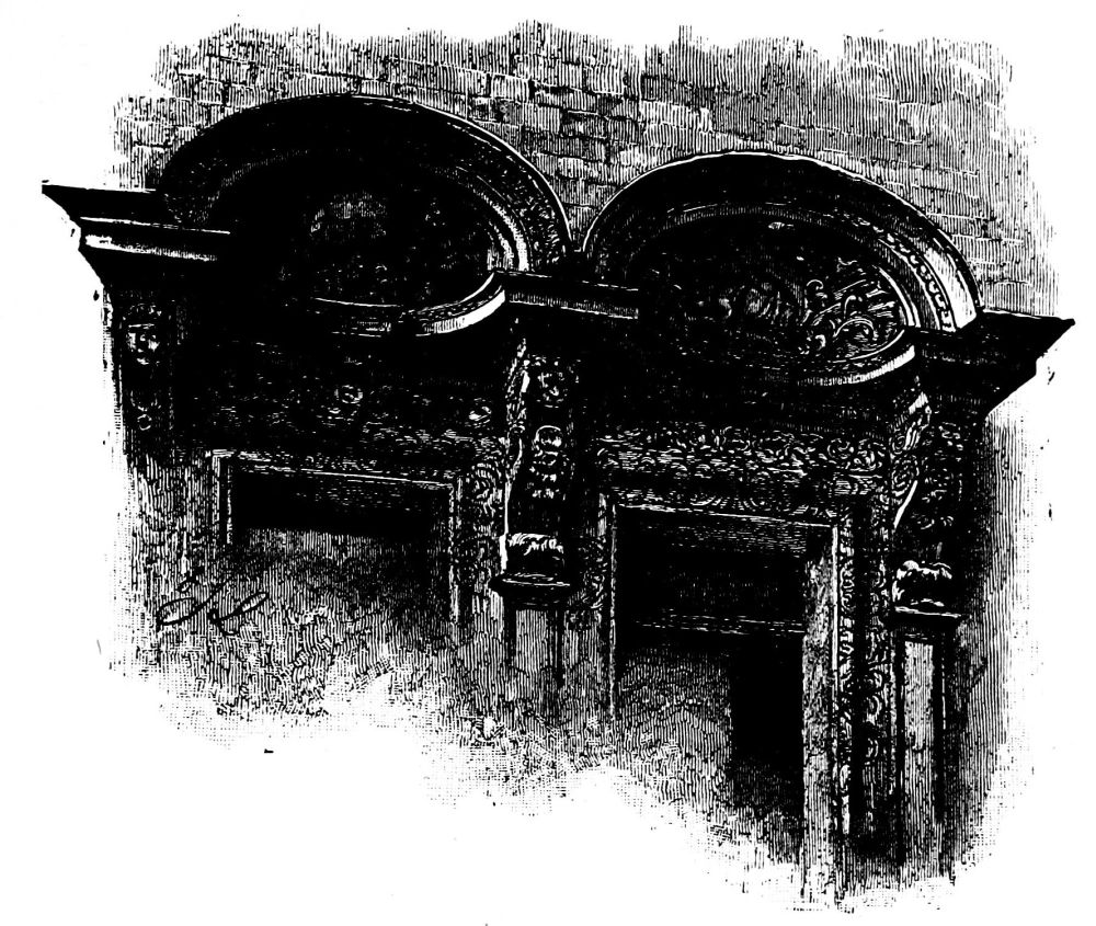 But the glory of the whole is the wonderful window over the Communion-table, with its fine depth of blue, a treat for the eye, and satiating it with colour. This impoverishes, as it were, all the modern performances near it. A great authority on painted glass, Mr. Winston, declares it to be “the most beautiful work in this respect, of harmonious colouring,” he was acquainted with. The subject is the Crucifixion. It is divided into five compartments, three of which are filled by pictures of our Saviour and the two thieves. Below them are the holy women, a crowd of Roman soldiers, etc.; over the good thief a tiny angel is seen, bearing off his soul to Paradise, while a little demon has the impenitent one on his back.{7} On one side is the portrait of a young king at his prayers, arrayed in crown and mantle, with the armed St. George overhead; on the other side a lady, also kneeling, over whom watches St. Catherine. This window had quite a strange course of adventures. According to one account, it was a present to King Henry VII. from the Dutch States-General, and was intended for his beautiful chapel. Another version runs that it was a present from the King and Queen of Spain, Ferdinand and Isabella. It took five years to make, and by that time King Henry VIII. had succeeded. Whether his religious views had altogether changed, or he had other reasons, the window was not set up, and he made it a present to the abbey at Waltham. On the Dissolution it was bought by General Monk, who brought it down to New Hall, where it was well protected during the Civil War. From New Hall it passed to a Mr. John Olmius, who sold the window to Mr. Conyers, of Copt Hall, where it was set up; and there it seemed likely to remain. Unluckily it entered into the minds of the Churchwardens’ Committee of St. Margaret’s, in 1758, to have a thorough restoration of their old church. Dreadful windows, the same that were to be seen about twenty years ago, were put in: a common “household parapet,” as it was called, was added, with the homely porch. But now they bethought themselves of Mr. Conyers’s beautiful window, and bought it for 400 guineas. Thereupon the Chapter, offended by its “Popish” character, commenced a lawsuit to have the window removed; but the action was decided against them. There is a loving cup which celebrates this victory. Thus this rich and glowing feast of colour was retained. Below it there is a curious oaken reredos, elaborately carved into the shape of a large picture—the Supper at Emmaus—the work of a Soho artist some 120 years ago. The pulpit is a rather fantastic thing, coloured like a sugar-plum. There is an antique bench in the porch, used at the distribution of the weekly dole of sixpences and bread to a number of poor widows.