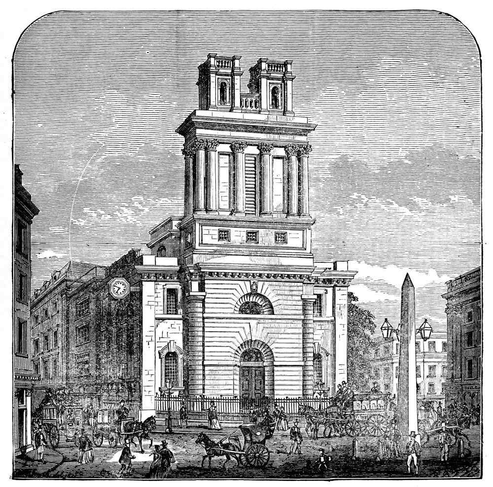 He is even more severe on some of the churches; for instance, All Souls, in Langham Place, “a circular building in two stories, with Ionic and Corinthian columns, surmounted by a pointed sugar-loaf.”