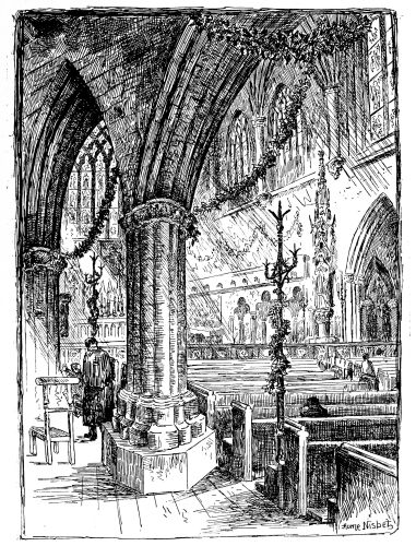 Some of the side windows are poor and thin in tone, as if done in water-{4}colour; but the rich depth and gorgeousness of the great window—as of old wine seen deep down in the glass—eclipses the rest. There is also a window to the memory of the ill-fated Lord Frederick Cavendish. The inscription is not particularly happy, and his fellow-victim is described as “Mr. T. N. Burke.” Another commemorative window which seems prosaic is that of the Jubilee, the Queen in the centre, in full view of her great ancestor Elizabeth. Here Mr. Browning furnished the verse:—