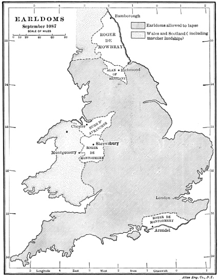 Christmas, 1077: King William; Lanfranc, archbishop of Canterbury; Thomas, archbishop of York; Odo, bishop of Bayeux; Hugh, bishop of London; Walkelin, bishop of Winchester; Remi, bishop of Lincoln; Maurice, the chancellor; Vitalis, abbot of Westminster; Scotland, abbot of Ch. Ch., Canterbury; Baldwin, abbot of St. Edmunds; Simeon, abbot of Ely; Aelfwine, abbot of Ramsey; Serlo, abbot of Gloucester; Earl Roger of Montgomery, Earl Hugh of Chester, Count Robert of Mortain, Count Alan of Richmond, Earl Aubrey of Northumbria, Hugh de Montfort, Henry de Ferrers, Walter Giffard, Robert d’ Oilli, Hamon the Steward, Wulfstan, bishop of Worcester.—Ramsey Chartulary, R. S., ii., 91.