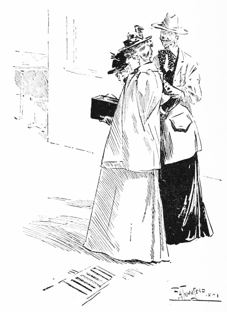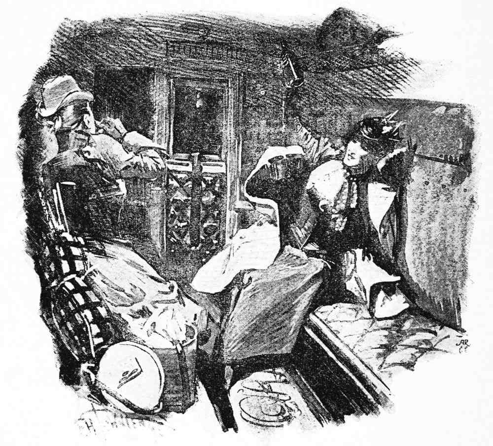 Before we reached Dover an example was vouchsafed to us in further proof, if such were needed, of the difficulty of saying good-bye agreeably at the window of a railway carriage. In this case the victims of the custom stood on the platform, smiling spasmodically at the other victim in the carriage, and saying at intervals, ‘Well, you’ll write, won’t you?’ ‘So good of you to come and see me off.’ ‘Well, mind you write!’ ‘Oh yes, dear, and be sure you give my love to Mary and Aunt Williams.’ Then they all smiled brightly and nodded their heads, and the traveller, with her chin upon the window-sill, beamed galvanically down upon her friends, and in her turn adjured them not to forget to write. As the train moved off at last, the farewells thickened to a climax,{20} and we were privileged to observe how, when the final delicate flutter of the hand had been given, the smile disappeared from the face of the traveller, and she thankfully yielded herself to the deferred enjoyment of her newspaper.