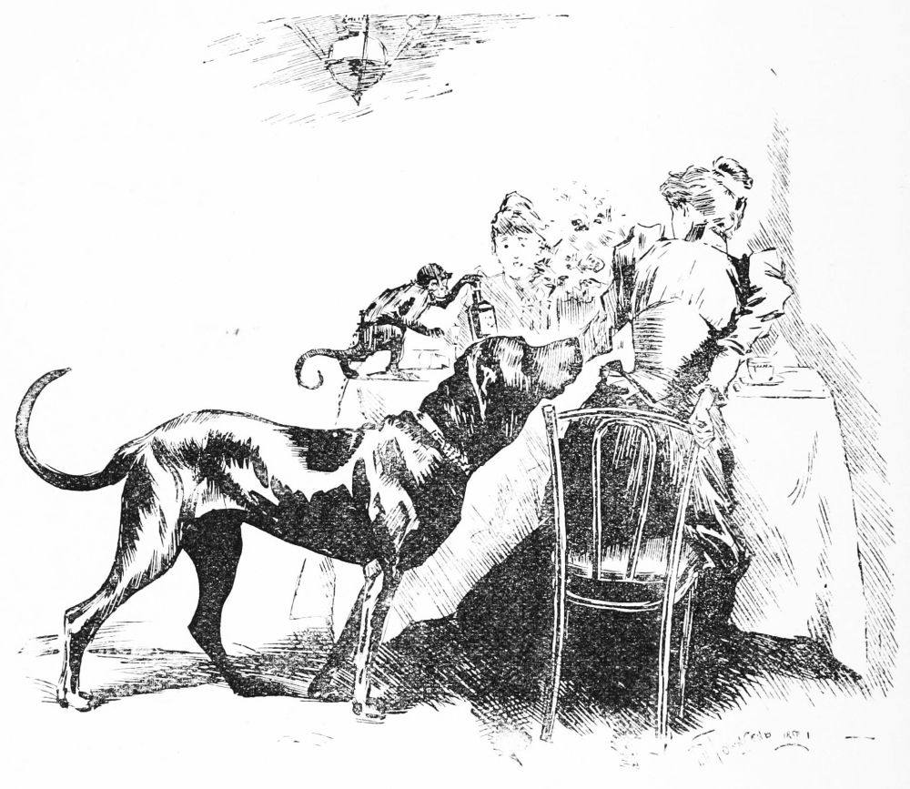 plate: excited harangues about vintages and grapes, that bristled with facts so esoteric and so solid that my cousin said she would fetch the note-book at once, and slipped away with the graceful bow to the company that we had observed society at Pauillac demanded. I had embarked on the eggs before she{61} came back, and was thinking how I could best express the curious flavour of the grease in which they were cooked, when I heard a slight scuffle at the door, and saw my cousin dart in with inflated eyes of terror, followed by a black boar-hound of about four feet high, on whose back was clinging a monkey of more than usually human and terrifying aspect. The dog approached with a slow politeness, and, as he came, the monkey leaped to and fro from his back to the tables, the chairs, the handle of the door, anything in fact within reach of his chain that presented a surface of a quarter of an inch, with the swinging bound and rebound of a toy on a piece of indiarubber. We cowered behind our table, and the danger was for the time averted by the intervention of some personal friend of the monkey, who, to our unspeakable thankfulness, took him out of the room.