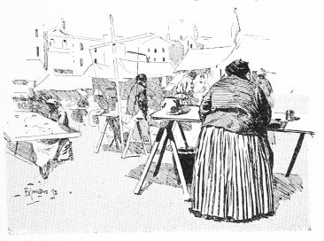 As we stood under the chestnut tree a sound as of the beating of eggs rose to us presently from a flagged yard about fifteen feet below our plateau, and, looking over the edge, we had an excellent bird’s-eye view of two young ladies engaged respectively in beating a yellow compound with a fork, and in shaking some other yellow compound in a frying-pan over a charcoal fire. One of them wore pince-nez, both had early Florentine shocks of hair, and a general appear{166}ance
