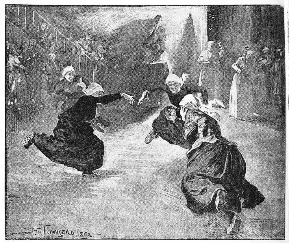 that followed. The little figures flew in darting circles, like flies on a pool, to the mad squeals of the ‘Bignou,’ their list-shod feet slapping the floor in absolute accord, and their full skirts and white cap-strings leaping out behind them in time to each angular twist of the tune. As we watched them we{217} no longer wondered at their age. Steps such as those could not be learned in less than seventy years.