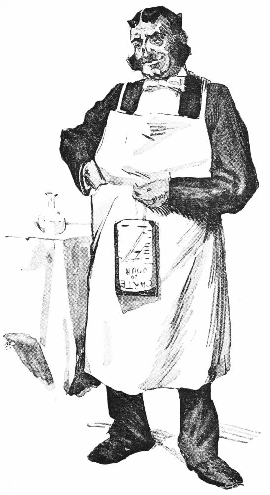 The advantages of an introduction were shown in the effusion of the proprietor’s greeting, and under the ministrations of Alphonse, the head waiter, we revived. We were late for the ordinary dinner, and for some time the clean, electric-lighted dining-room had us for its only occupants, as we sat in a trance of repose and quietness, while Alphonse, with his decorous hooked nose and clerical black whiskers, gave us his serious and undivided attention. It was not until after the delicious omelette au rhum had come in, in its winding-sheet of spectral blue flame, that a party entered and took possession of a table near us. From the unhurried way in which they{223}
