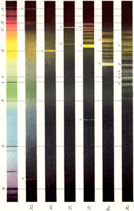 309. Anfänge der Spektralanalyse. – 310. Die Entdeckung der Fraunhoferschen Linien. – 312. Bunsen und Kirchhoff erfinden das Spektroskop. – 313. Die Spektren der Metalle. – 314. Die Empfindlichkeit der Spektralreaktion. – 316. Die Umkehrung der Spektren. – 317. Emission und Absorption. – 318. Die spektralanalytische Untersuchung der Sonne. – 320. Die Entdeckung neuer Elemente. – 322. Verbesserungen des Spektroskops. – 323. Anwendungen der Spektralanalyse. – 324. Spektroskopie und Astronomie. – 325. Anfänge der Photographie. – 327. Photographie und Astronomie. – 328. Farbenphotographie.