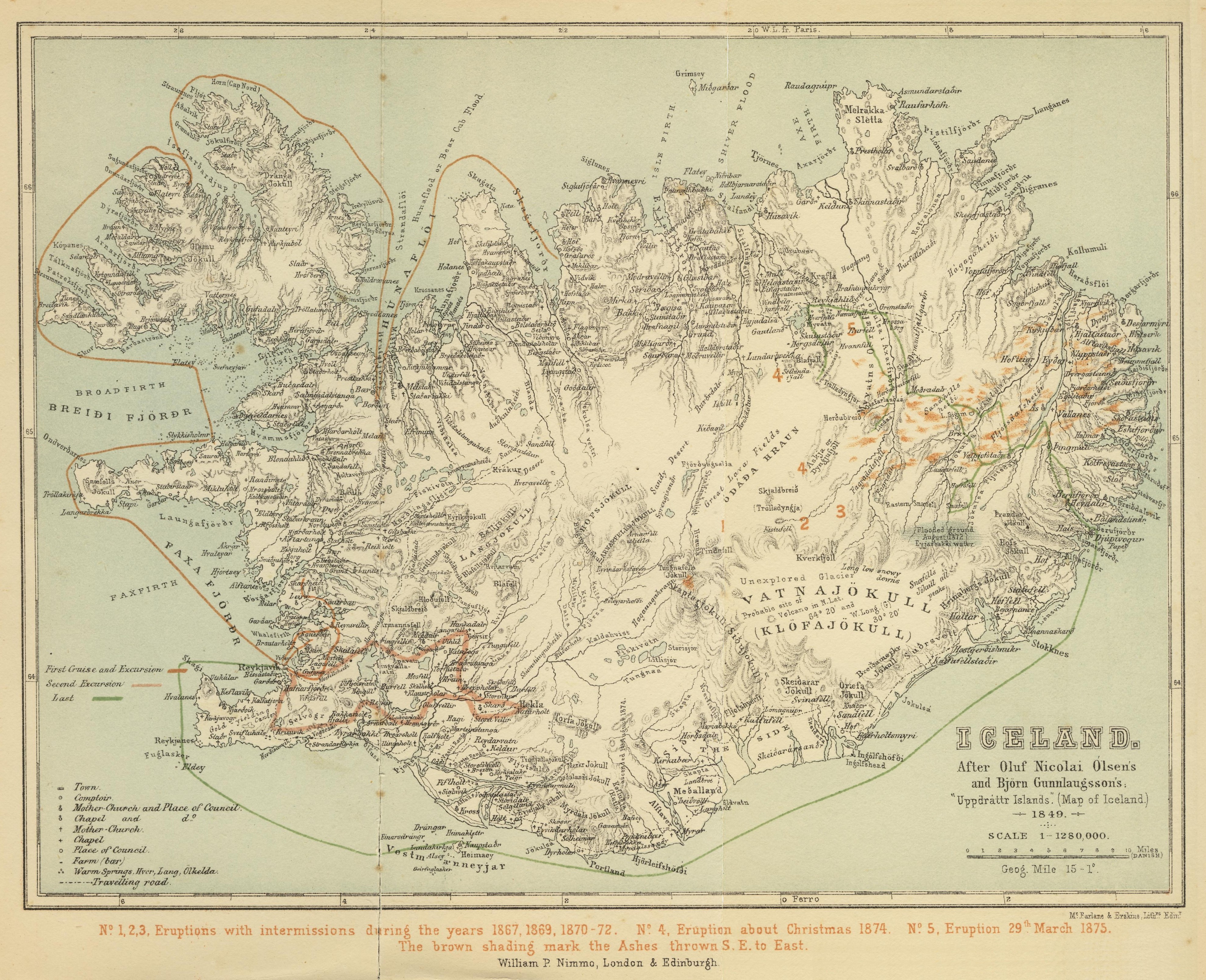 Shortly after returning to England, I published, in the columns of the Morning Standard (October to November 1872), two letters for the benefit of intending tourists and explorers. Written in the most sober and realistic style, and translated into many of the languages of Europe, they gained for me scant credit at home. “Old Identity” again kicked against the goad of “New Iniquity,” and what could I expect? Mackenzie and Henderson, who would “feast wondering eyes” upon everything and everybody, had set the example of treating Iceland as an exceptional theme. They found followers: even the hard-headed Scot gallops between Reykjavik and Thingvellir along the edge of a “dreadful precipice,” where I saw only the humblest ravine; and travellers to the age-weary, worn-out Geysir rise at midnight in their excitement to sing those “grand old psalm-tunes, such as York and the Old Hundredth.” Need it be said that Mr Cook’s pilgrim-tourists have done exactly the same thing in the Holy Land?