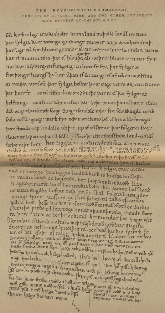 There are also two presses containing antiquities, presented by Mr Henderson, son of the well-known Icelandic traveller; the Lord’s Prayer in old characters, ancient annotations of music, and a document with the signature of the martyr (?) Jón Árason, “Biskup à Hólum.” The seal, printed on red wax, bore a crucifix with the bishop standing to the left: on the right was a mitre and a shield charged with a lily.