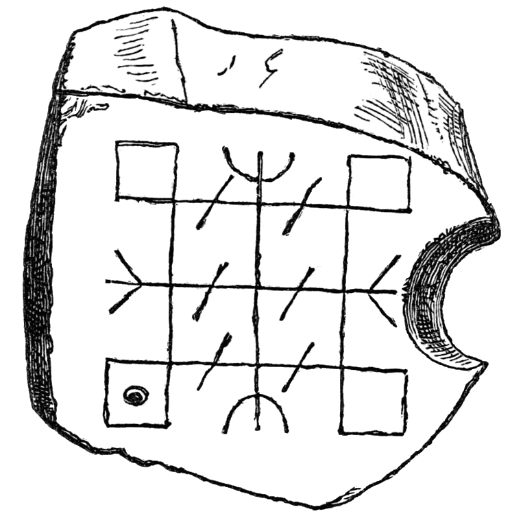 Over the western doorway hangs an old lace bed-curtain, white, and well made. Scattered about the room are various articles—viz.: 1. A wooden plank with an epitaph dated 1755, and quite in the style of the “lying tombstone;” 2. Carved door-posts for the church or the house; 3. A large wooden chair, the arms ending in carved knights, whose horses are those of our{23} chessmen; and 4. A beam, ten feet long, pierced with thirty-two holes—with such an instrument Penelope might have woven her web. There is also a specimen of the old Flekí, two or three boards thirty-two inches long by twenty-eight; it was drilled with holes pierced for snares of twisted horsehair, and anchored off some skerry with ropes, and stones or horse-bones. A decoy bird upon each instrument was useful to catch guillemots.{24}