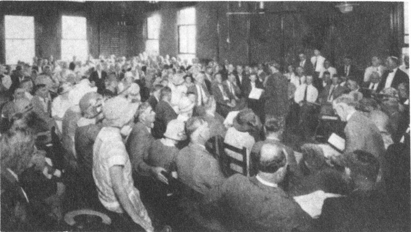 The “big singings” take place at county seats and in even larger centers. Here the country folk join in song with those who, though they live in the cities, have grown up in the same rural musical tradition. The Alabama State Sacred Harp Singing Association was pictured in its 1929 summer session in the court house in Birmingham, Alabama.