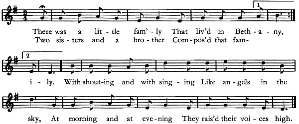 The old song books spoken of above contain various sorts of religious pieces. Among these are the early psalm tunes, evangelical hymns, spiritual songs, religious ballads, “fuguing” songs, and anthems. Each of these varieties represents 5 loosely a phase of, or a period in, religious, musical, or poetic development. Some are folk-songs and many are not. The psalm tunes with their Old-Testament texts—the sober song fare of the early Protestants in Europe, in the British Isles, and in the American Colonies—are probably to some extent of folk origin; but since psalm singing in early America can not be looked on as a free expression of the folk, and since the psalm tunes themselves gave way easily to other far more folky types of religious song, I have chosen to exclude them from the present discussion and collection. The fuguing songs are examples of an early American art development in composing and in group singing in New England during the latter part of the eighteenth century. Despite their enduring popularity in southern rural folk-singing circles and despite the fact that many of them are found to be constructed on the basis of folk-melodic themes, I have decided that they would be inappropriate to this collection. The same objection, that they are of an essentially composed nature, holds also for the anthems and has demanded their elimination.