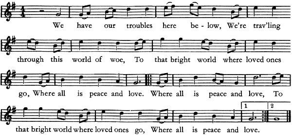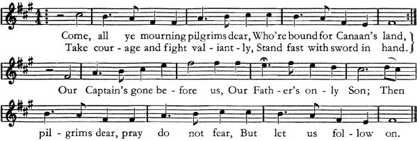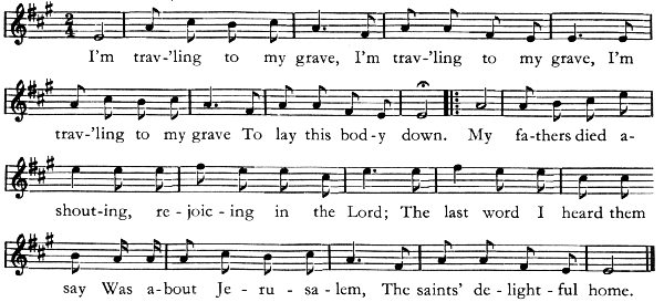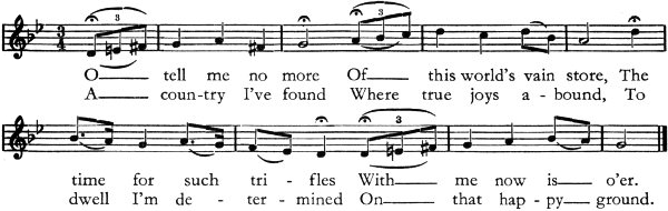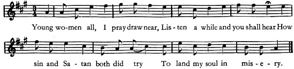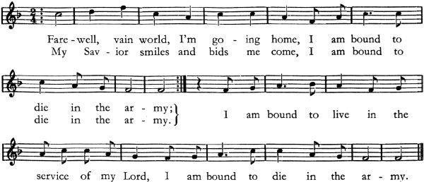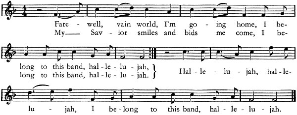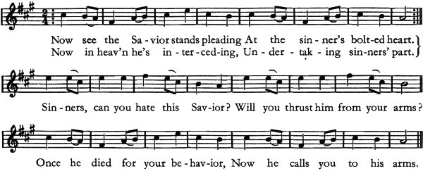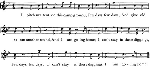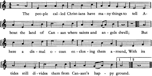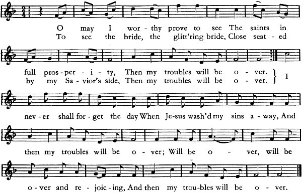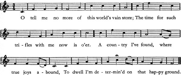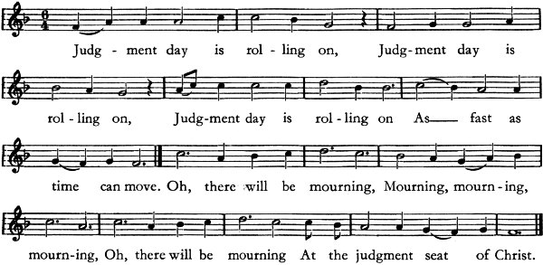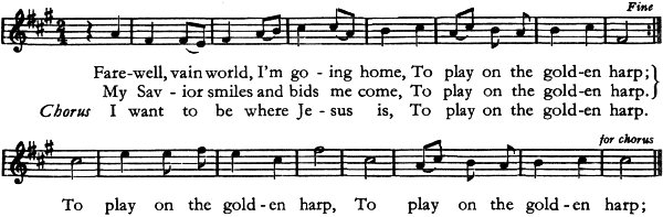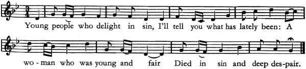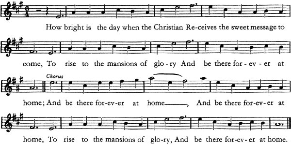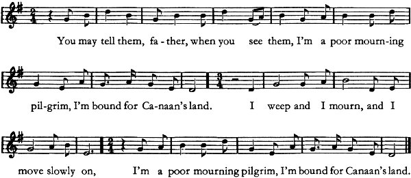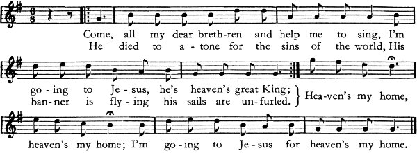 A younger variety of song which I include under the heading of religious ballads is that in which the singer tells his story in the first person. Such stories are those of the poor wayfaring stranger just a-going over Jordan, the departing preacher or missionary, a dying boy or girl, and even a pious gold hunter dying on his way to California. The story may be also the plaint of the religious “mourner”, the backslider, and the criminal sinner, or the exultant tale of the saved. Still another group of ballads is aimed more directly at the conversion of the “young, the gay, and proud.” They usually begin by telling the religious experience of the singer and close with a warning as to the tragic results of worldliness and an exhortation to turn from “this vain world of sin.” These songs are quite similar to the worldly ballads in form, and their tunes are, as will be pointed out presently, of the common folk stock.