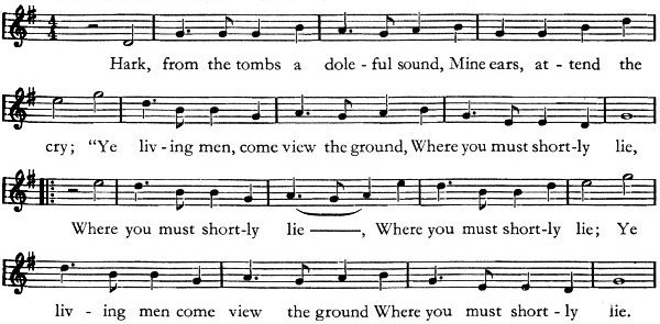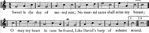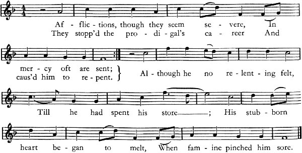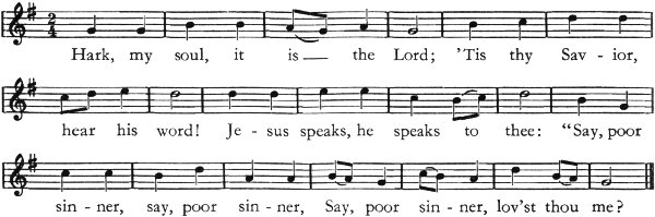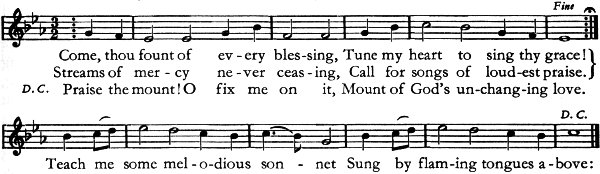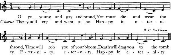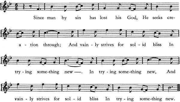 In the seventeenth and eighteenth centuries the Puritan congregations of New England are said to have had music committees one of the chief duties of which was to go among the folk and gather attractive melodies to be used as hymns. And this was also the custom of the Primitive Methodists, both in Great Britain and in America. In writing of this usage at a later date, Chappell says: “The Primitive Methodists ... acting upon the principle of ‘Why should the devil have all the pretty tunes?’ collect the airs which are sung at pot and public houses, and write their hymns to them ... in this sect we have living examples of the ‘puritans who sing psalms to horn-pipes,’ They do not mince the matter by turning them into slow tunes, ... but sing them in their original lively time.”