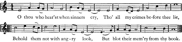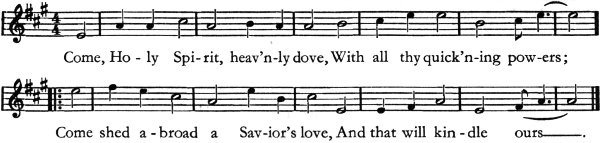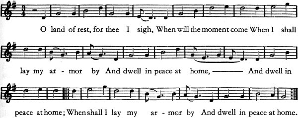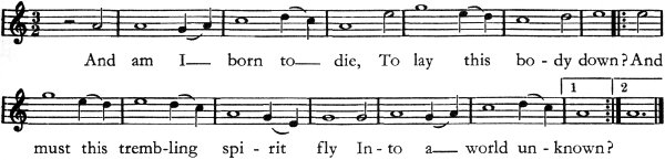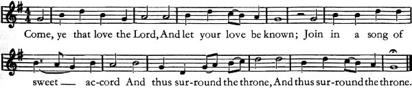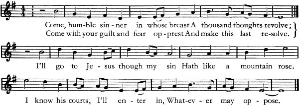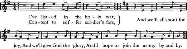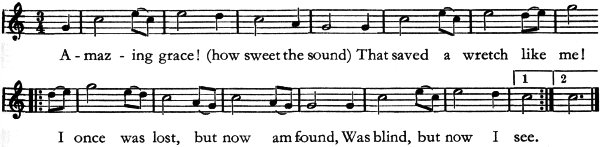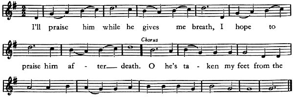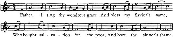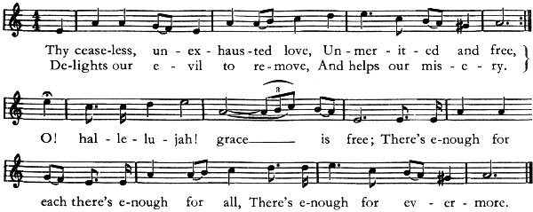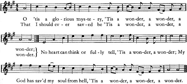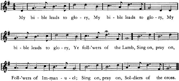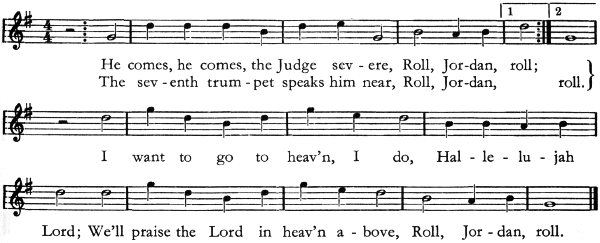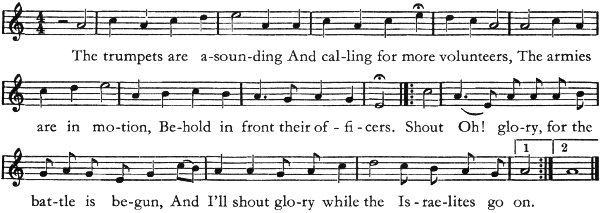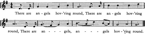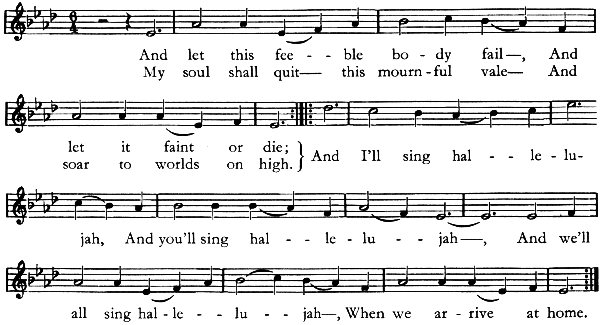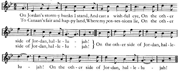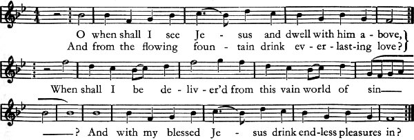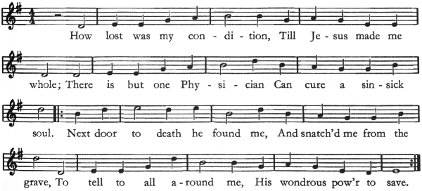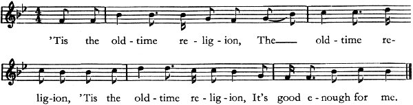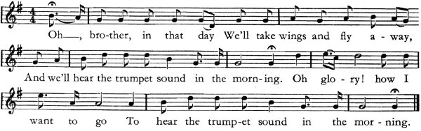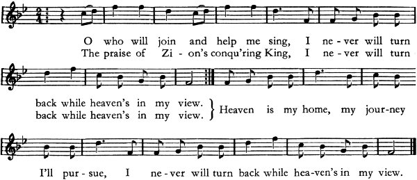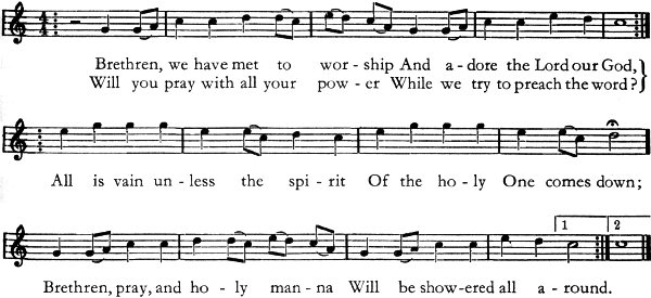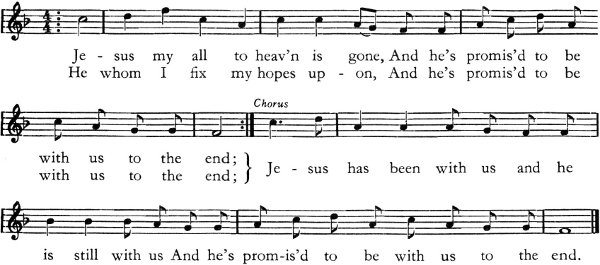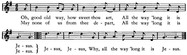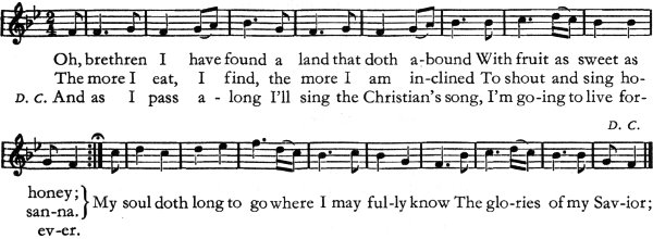 Bearing all this in mind it is perhaps easier to understand how the folk-hymns—grown up in a less boisterous environment—failed to satisfy the new conditions. At the camp meetings it was not a question of inducing every one to sing, but of letting every one sing, of letting them sing songs which were so simple that they became not a hindrance to general participation but an irresistible temptation to join in. The tunes of the folk-hymns were adequate. But the texts (Watts, Wesley and their schools) still demanded a certain exercise of learning and remembering which excluded many from the singing. The corrective lay in the progressive simplification of the texts; and it was in the main this text simplification which brought about and characterised the type of camp-meeting song which was called, in contradistinction to all other types, the spiritual song.