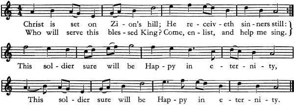 In looking through the folk-hymns in the second part of this collection one will see scores of tunes which are clearly recognizable as those still sung to ‘Barbara Allen’, ‘Lord Lovel’ and other ancient ballads. This is adequate evidence, I assume, as to where the folk sought and found its hymn tunes. The extent of this tune borrowing process is indicated on page 18f of this Introduction. The texts, on the other hand, may be from the pen of Watts or other eighteenth century English religious poets, or they may be the humbler creations of rural American religious verse makers, like John Adam Granade, or John Leland.