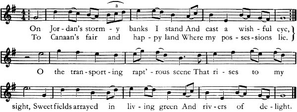 Further stanzas of the text are given under ‘Jordan’. The combination here of the widely sung words of Samuel Stennett and an especially folkish revival phrase has resulted in an enormously well liked spiritual. Found also SOH 51, HH 154, SOC 114, HOC 47, WP 53, GOS 512. Its first appearance in the fasola books seems to have been in the Southern Harmony of 1835 where it is attributed to Miss M. Durham. The tune is like ‘I’ll Go and Enlist for a Sailor’, Sharp, Morris Dances, Set viii, No. 6.