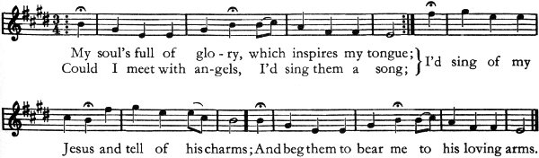 It is impossible to date the beginning of folk-hymn making and singing in America definitely. But on the assumption that they were a part of the Wesleyan movement, we cannot place the beginning of their general use in America before the 1770’s. The part of the land where they first attained popularity—again judging by their Wesleyan affinities—was the upland and inland South; for during the last two decades of the eighteenth century (the time of the first spread 7 of the Methodist movement) four-fifths of the adherents to this sect were to be found in that section.[3]