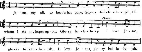 The text simplification in religious folk-songs began modestly. The variety of spiritual song which is closest to the folk-hymn is that in which each short stanza of text (four short lines usually) is followed by a chorus of the same length, as for example: