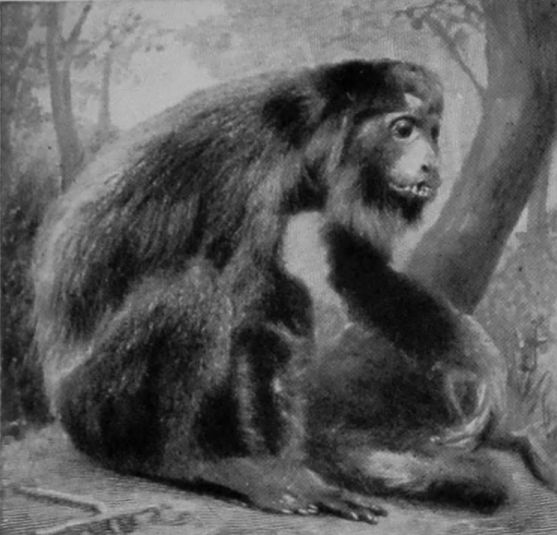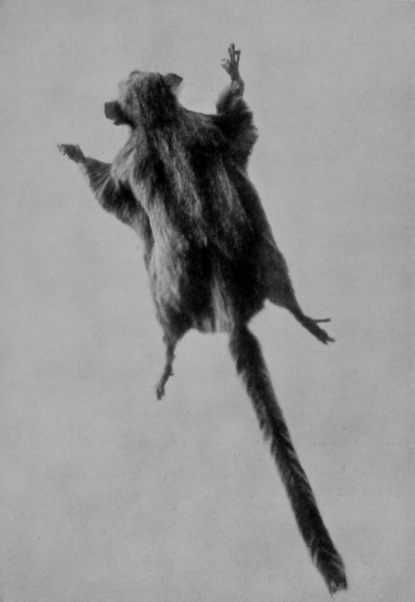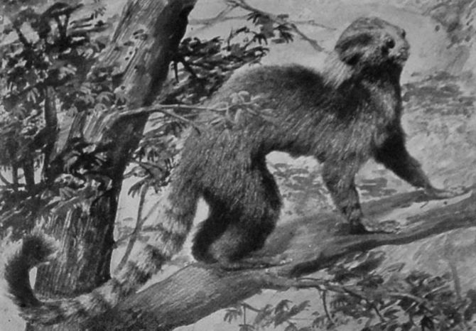 A third and very distinct type of American opossums is the one represented on page 380, which, from its mouse-like size and aspect, is commonly known as the Murine Opossum. The most distinct feature of this little animal is that, though a genuine marsupial, it has no pouch, but carries its young on its back, the little creatures twining their tails round that of their mother, and so securing a stable anchorage. Although thus loaded up and transformed for the time being into a sort of combination perambulator and feeding-flask, the happy but anxious parent pursues the even tenor of her way among the tree-branches and thicket-growths with almost unabated agility. This species, in common with Meriam's Opossum and the Woolly Opossum and several others which carry their young, to as many as a dozen {379}in number, on their backs, are denizens of tropical South America. One of these, named the Philander Opossum, attains to the somewhat larger size of about 2 feet in total length, the long prehensile tail representing, however, the greater moiety of these dimensions.