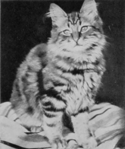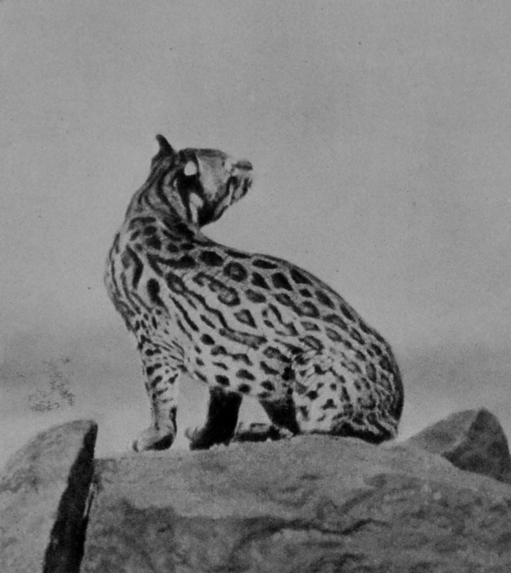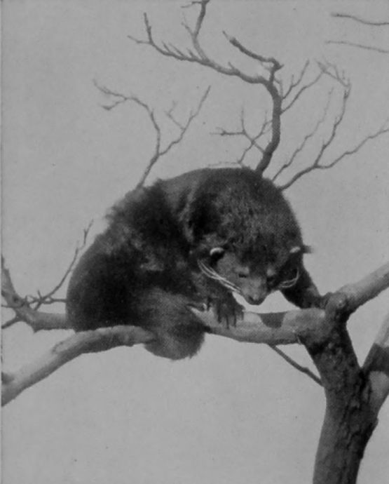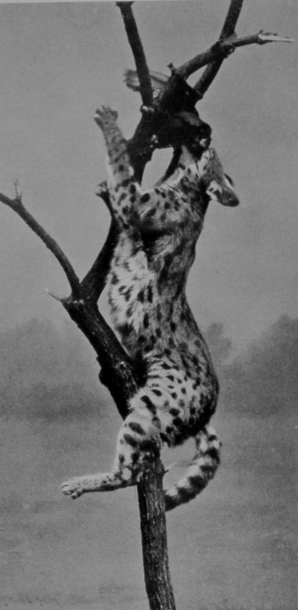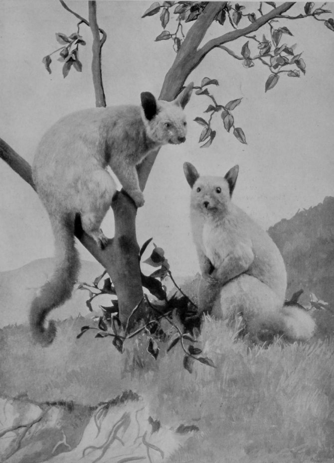 The animals common in Tasmania and throughout the greater portion of the Australian Continent, and familiarly known as Spotted or Native Cats, and to zoologists as Dasyures, enjoy also an unenviable reputation for their depredations among the settlers' hen-roosts. To look at, these native cats are the most mild-mannered and inoffensive of creatures. Actually, however, they possess the most bloodthirsty proclivities, and may be aptly compared in their habits to the stoats, weasels, polecats, and other Old World carnivora. There are some five known species, the largest being equal to an ordinary cat in size, and the smaller ones about half these dimensions. All of them are distinguished by their spotted pattern of ornamentation, such spots being white or nearly so, and more or less abundantly sprinkled over a darker background which varies from light grey to chocolate-brown. In the commonest form, represented in the accompanying photograph, the ears and the under surface of the body are also often white. No two individuals, however, are to be found precisely alike in the pattern of their markings. The dasyures differ from the two preceding types, the Tasmanian wolf and the devil, in being essentially arboreal in their habits, living by day and breeding, as the majority of the Australian opossums, in the hollow gum-tree trunks, from which they emerge at nightfall to seek their food. This, in their native state, when hen-roosts are not accessible, consists mainly of birds and such smaller marsupial forms as they can readily overpower.