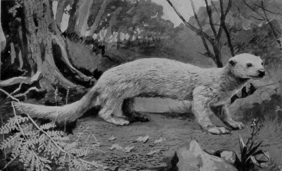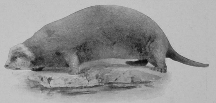 The little group of the American marsupials contains some three or four generically distinct types whose relationship with the Australian members of the order is in the direction of the dasyures and bandicoots rather than with the kangaroos and phalangers. Included in one family, they are popularly known as Opossums, but differ among themselves very considerably both in aspect and habits. The most remarkable among them is undoubtedly the so-called Yapock, or Water-opossum, an inhabitant of South America, and ranging in its distribution from Guatemala to Brazil. In both form and habits this animal so closely resembles an otter that it was referred by the earlier naturalists to the Otter Tribe. It tunnels holes in the banks of the rivers it frequents, and feeds entirely upon fish, crustacea, and aquatic insects. The feet, and more especially the hind ones, are distinctly webbed; the tail is naked, scaly, and non-prehensile; and the fur is short and thick, as in the ordinary otters. The ground-tint of the fur is a light grey: this is diversified by a black or dark brown stripe that runs down the centre of the back, and expands over the shoulders, loins, and hindquarters into saddle-shaped patches or bands of the same dark hue.