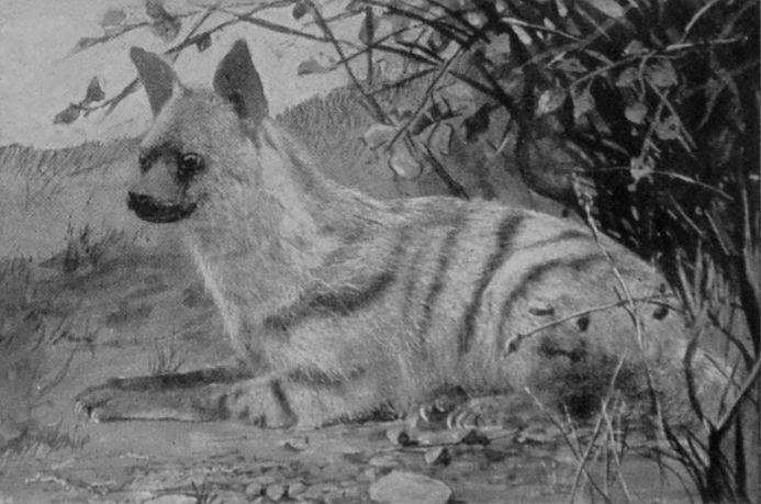 The remaining family of the Australian marsupials constitutes a parallel to the carnivorous order of the higher mammalia, all its members being more or less flesh-eaters, and having their dentition modified with relation to such habits. One of these (the Tasmanian Wolf, or Tiger of the colonists, better known to zoologists as the Thylacine) is an animal of considerable size. Its dimensions equal those of a wolf or mastiff, with which the contour of its body and more especially that of the head very nearly correspond. In common with the true dogs, the thylacine hunts its prey by scent. This is well attested to by the following incident, as related by eye-witnesses. While camping out among the hills in Tasmania their attention was attracted very early one morning by a brush-kangaroo hopping past their fire in an evidently highly excited state. Some ten minutes later up cantered a she thylacine with her nose down exactly on the track, evidently following the scent, and in another quarter of an hour her two cubs came by also in the precise track. While not very swift, the Tasmanian "tigers" possess immense staying power, and will keep up a long, steady canter for many hours on end. Accustomed in its primitive state to run down and prey upon the kangaroos, wallabies, and other weaker marsupial mammals indigenous to the regions it inhabits, the Tasmanian wolf speedily acquired a predilection for the imported flocks of the settlers, and proved almost as destructive to them as its Old World namesake. To check its ravages, a price was put upon its head by the Tasmanian Government; and this measure, in conjunction with the rapid advances towards the complete settlement of the country which have been accomplished within later years, has compassed this animal's extermination in all but the wildest and {373}most inaccessible mountain districts. The colour-markings of this animal are somewhat striking, the grey-brown tints which characterise the ground-hues of the body and limbs being varied by a series of dark bands traversing the buttocks, these being widest in this region, and continued forwards to the middle of the back. A somewhat similar cross-stripe pattern of ornamentation occurs in the relatively small member of the same family described later on as the Banded Ant-eater.