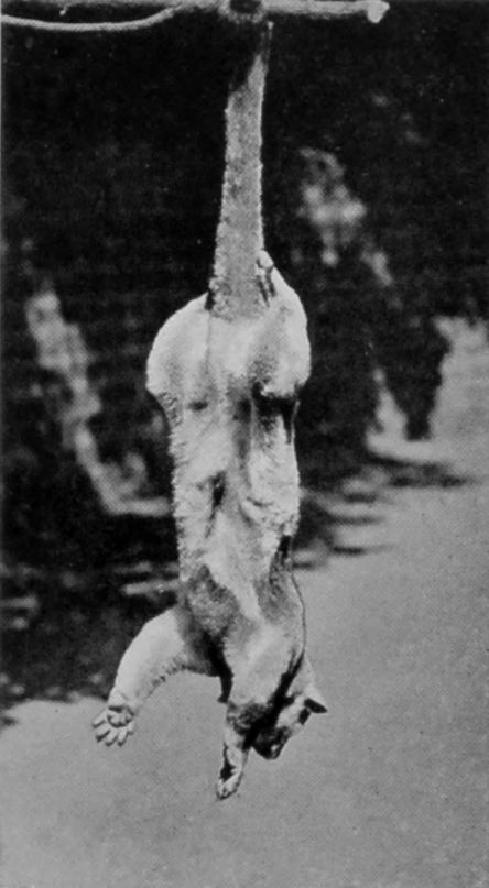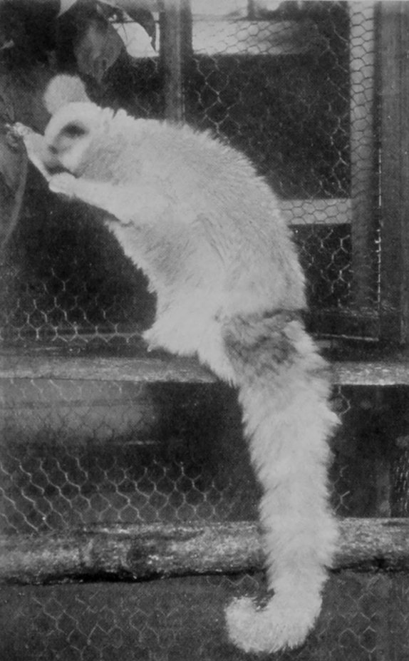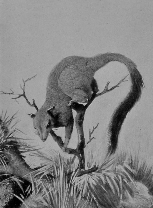 The opossum, like the rat, is an omnivorous feeder; and being of so much larger size, and possessing an insatiable appetite, constitutes itself a veritable pest to the fruit-grower, the agriculturist, and the poultry-farmer. In effecting its entrance to hen-roosts or other food-yielding enclosures, it exhibits an amount of cunning and pertinacity possessed by no other mammal. Caught red-handed in these depredations, it has recourse to stratagems which have won for it a reputation that has long since passed into a household word. Feigning death, or "playing 'possum," is a game at which it is well known to be a past-master, but by {378}which it still frequently succeeds in hoodwinking the unwary, and so saves its skin. Discovered thieving, and receiving perhaps a haphazard but by no means disabling blow, it at once collapses, and with film-covered eyes and protruding tongue is to all intents and purposes dead. It may be kicked round the premises, and finally probably taken up by the tail and flung ignominiously outside, without betraying vitality by even so much as a wink. But no sooner is the coast thoroughly clear of the avenger than the stiffened limbs relax, the eyes reopen, and Brer 'Possum trots off, as fresh as ever. Maybe it is the ripening maize or the persimmon-patch that next engages his attention, and in either case he walks in and feeds right royally, laying up a goodly store of fat against the approaching winter months of scarcity.