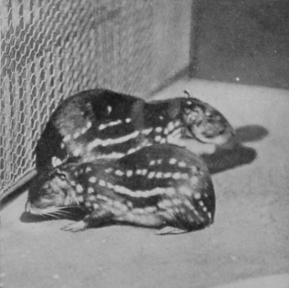 The most interesting biological peculiarity of this animal is the abnormal development of its teeth. These number as many as from fifty-two to fifty-six, and exceed the dental formula of any other known existing marsupial. The usual colour of this interesting little animal is a warm chestnut-brown, banded transversely over the back with white, these stripes being widest and most conspicuous over the hindquarters. This somewhat paradoxical marsupial possesses no pouch, the young, when first born and attached to the nipples in the manner characteristic of ordinary marsupials, being covered over and concealed among the longer hairs that clothe the abdominal region. In the dasyures, or native cats, previously described, the pouch exists only in a rudimentary condition, its function being fulfilled by merely a few skin-folds; while in the "tiger" and native devil the pouch, contrary to that of the kangaroos, opens backwards.