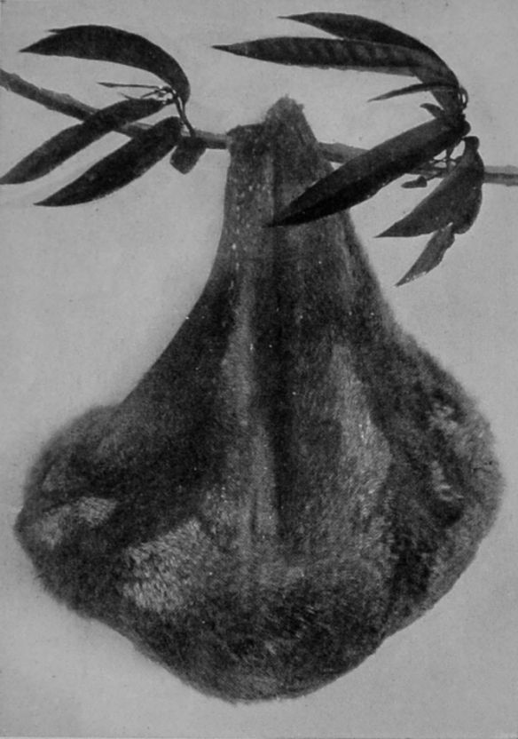 Although fattening up against the winter, he, even in his most northern limits, does not hibernate, but may even be seen leisurely picking his way over the snow, probably tracking some unfortunate squirrel to its lair, which in due time is located, dragged out, and devoured. While assimilating his meal of flesh or fruit, Brer 'Possum likes to have all four hands at liberty, his hind feet being also graspers; and so he twists his tail round a convenient branch, and, hanging perdu, leisurely enjoys his feast. The opossum, like the rat—to which it has in aspect and many of its habits been likened—is a most prolific breeder, as many as from six to sixteen young being comprised in the litter. When born, they are immediately transferred to the somewhat capacious pouch, and remain there without venturing outside until they are about the size of an ordinary mouse.