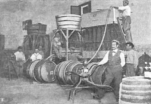 3. Residui fecciosi. — I residui fecciosi che rimangono sul filtro contengono ancora da 75 a 80% di mosto della stessa composizione chimica del filtrato e 20 a 25% di sostanze solide che si compongono per la massima parte di cellule di fermenti, accompagnate da cristalli di cremore, frammenti di bucce e da qualche vinacciuolo. Tali residui stanno nella proporzione di 2 a 3 p. % rispetto al mosto [154] grezzo, a seconda le annate e le qualità dei mosti. Quando si tratti di piccole quantità si vendono ai fecciaioli a metà prezzo circa della feccia umida del vino, per quantità invece di una certa importanza, si usa riunire tutti i residui di diversi giorni di lavorazione in una botte o tino, ove completano la fermentazione alcoolica producendo un vino quasi normale.