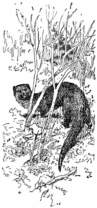 Ik zat heel stil een eind op zij en hij zag me niet. Dicht bij de val van den ouden Noel hield hij even [36]stil met opgeheven kop, in die eigenaardige slangachtige houding, die alle wezels aannemen als ze acht geven. Daarop glipte hij om het uiteinde van de val en verdween, het pad af.
