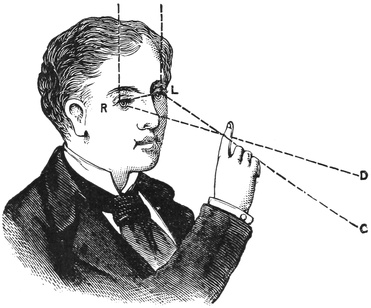 I shall so often have to speak of the distances of the celestial bodies that I may once for all explain how it is that we have been able to discover what these distances are. This would be a very puzzling matter if we were to try and describe it fully, but the principle of the method is not at all difficult. Do you know why you have been provided with two eyes? It is undoubted that one of the reasons is to aid you in estimating distances. You see this boy (Fig. 4) judges of the distance of his finger by the inclination of his two eyes when directed at it. In a similar way we judge of the distance of a heavenly body by making observations on it from two different stations.