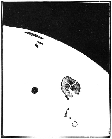 We thus realize the enormous size of the Great Nebula. It appears that if, on a map of this object, we were to lay down, accurately to scale, a map of the solar system, putting the sun in the centre and all the planets around in their true proportions out to the boundary traced by Neptune, this area, vast though it is, would be a mere speck on the drawing of the object. Our system would have to be enormously bigger before it sufficed to cover anything like the area of the sky included in one of these great objects. Here is a sketch of a nebula (Fig. 91), and near it I have marked a dot which is to indicate our solar system. We may feel confident that the Great Nebula is at the very least as mighty as this proportion would indicate.