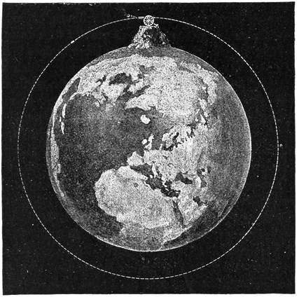 I ought here to explain a principle which those who are learning about the stars must always bear in mind. The principle asserts that the further a body is, the smaller it looks. Perhaps this will be understood from the adjoining little sketch (Fig. 8). It represents a great globe, on which oceans and continents are shown,26 and you see a little boy and a little girl are looking at the globe. The girl stands quite close to it, and I have drawn two dotted lines from her eye, one to the top of the globe, and the other to the under surface. If she wants to examine the entire side of the globe which is visible to her, she must first look along the upper dotted line, and then she must turn her glance downwards until she comes to the lower line, and having to turn her eyes thus up and down she will think the globe is very big, and she will be quite right. The boy is, as you see, on the other side of the globe, but I have put him much further off than the girl. I have also drawn two dotted lines from his eye to the globe, and it is plain that he will not have to turn his head much up and down to see the whole globe. He can take it all in at a glance, and to him, therefore, the globe will appear to be comparatively small, because he is sufficiently far from it. The more distant he is, the smaller it will appear. You can easily imagine that, if the globe were far enough, the two lines that would include the whole would be like those shown (Fig. 9), in which the globe is so distant that it cannot be seen in the picture. The apparent size of the globe, which is really measured by the angle between these two lines,27 would always be smaller and smaller according as the distance was greater. Now you can understand why an object seems smaller the further away it is; indeed, when sufficiently far, the object ceases to be visible at all.