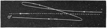 If we have any assurance that the star is surrounded by a mass of this glowing vapor, then it may be possible to measure that nebula’s distance. It will occasionally happen that grounds can be found for believing that a star which appears to be in the glowing gas does veritably lie therein, and is not merely seen in the same direction. There are hundreds of stars visible on a good drawing or a good photograph of the famous object in Andromeda, and doubtless large numbers of these are merely stars which happen to lie in the same line of sight. The peculiar circumstances attending the history of one star seem, however, to warrant us in making the assumption that it was certainly in the nebula. The history of this star is a remarkable one. It suddenly kindled from invisibility into brilliancy. How is a change so rapid in the lustre of a star to be accounted for? In a few days its brightness had undergone367 an extraordinary increase. Of course, this does not tell us for certain that the star lay in the glowing gas; but the most rational explanation that I have heard offered of this occurrence is that due, I believe, to my friend Mr. Monck. He has suggested that the sudden outbreak in brilliancy might be accounted for on the same principles as those by which we explain the ignition of meteors in our atmosphere. If a dark star, moving along with terrific speed through space, were suddenly to plunge into a dense region of the nebula, heat and light must be evolved in sufficient abundance to transform the star into a brilliant object. If, therefore, we knew the distance of this star at the time it was in Andromeda, we should, of course, learn the distance of that interesting object. This has been attempted, and it has thus been proved that the Great Nebula must be very much further from us than is that368 star of whose distance I attempted some time ago to give you a notion.
