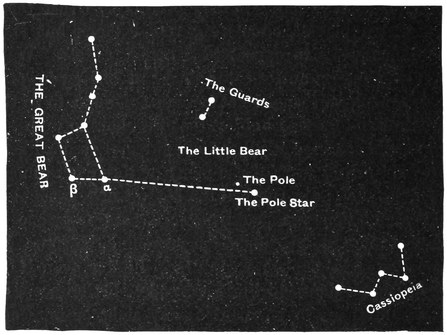 The Pole Star belongs to a constellation which we call the Little Bear; two other conspicuous members of this group are the two “Guards”; you will see how they are situated from Fig. 82, p. 322. They lie nearly midway between the Pole Star and the last of the three stars which form the Great Bear’s Tail. The same figure will also introduce us to another beautiful constellation, namely, Cassiopeia. You will never find384 any difficulty in identifying the figure that marks this group if you will notice that the Pole lies midway between it and the Great Bear.