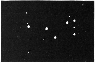 Of late years we have learned a great deal about nebulæ, by the help which photography has given to363 us. Look at this group of stars which constitutes that beautiful little configuration known as the Pleiades (Fig. 89). It looks like a miniature representation of the Great Bear; in fact, it would be far more appropriate to call the Pleiades the Little Bear than to apply that title to another quite different constellation, as has unfortunately been done. The Pleiades form a group containing six or seven stars visible to the ordinary eye, though persons endowed with exceptionally good vision can usually see a few more. In an opera-glass the Pleiades becomes a beautiful spectacle, though in a large telescope the stars appear too far apart to make a really effective cluster. When Mr. Roberts took a photograph of the Pleiades he placed a highly sensitive plate in his telescope, and on that plate the Pleiades engraved their picture with their own light. He left the plate exposed for hours, and on developing it not only were the stars seen, but there were also patches of faint light due to the presence of nebula. It could not be said that the objects on the plate were fallacious, for another photograph was taken, when the same appearances were reproduced.