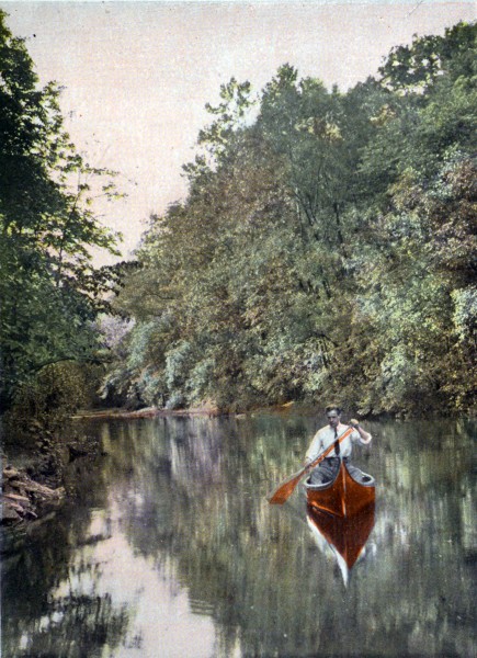 With a quick plunge of the paddle Ethan guided the canoe past the threatening bar. A drooping branch[10] swept his face caressingly as the craft gained the quiet water beyond. Here, as though repentant of its impatience, the river loitered and lapped about a massive granite bowlder, tugging playfully at the swaying ferns and tossing scintillant drops upon the velvety moss. To the left, the fringe of woodland which, in friendly gossip, had followed the little river for a quarter of a mile, parted where a second stream, scarcely more than a brook, flowed placidly into the first. Reinforced, the river widened a little and went slowly, musically on under the drooping branches, alternately sun-splashed and shadowed, until it disappeared at a distant turn. But the canoe did not follow. Instead it rocked lazily by the bowlder, while the ripples broke gently against its smooth sides.