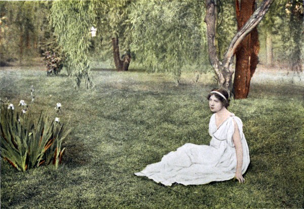 And all the while—a very little while despite the telling—his eyes ranged from the sandaled feet to the warm brown hair with its golden fillet. A single garment of gleaming white reached from the feet to the shoulders where it was caught together on either side with a metal clasp. The arms were bare, youthfully slender, aglow in the sunlight. And yet it was to the eyes that his gaze returned each time. “Minerva!” his thoughts triumphed, “‘Minerva, goddess azure-eyed!’” And yet in the next instant he knew that while her eyes were undeniably[21] blue she was no wise Minerva. Such youthful softness belonged rather to Iris or Daphne or Syrinx.