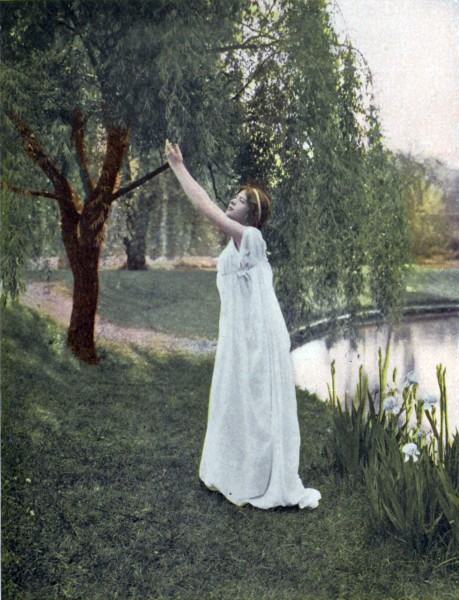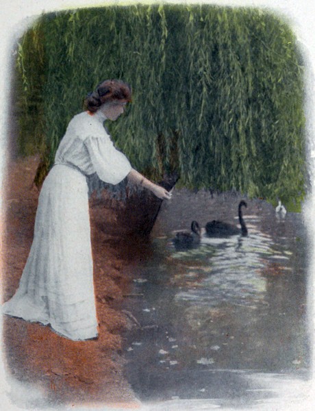 It was a beautiful scene into which Ethan had floated. Overhead was a blue sky against which a few soft white clouds hung seemingly motionless as though, like Narcissus, they had become enamored of their reflections in the pool there below. On a tiny islet in the pool, dwarf willows[19] caressed the water with the tips of their pendulous branches. Further on a trio of white swans sunned themselves, and about the margin the bosom of the pool was carpeted with lily-pads and starred with a multitude of fragrant blooms, white, rose-hued, carmine, pale violet, sulphur-colored and blue. The gauze wings of darting dragon-flies caught the sunlight, insects hovered above the flower-cups and in the branches around many a feathered cantatrice was singing her heart out. And for background there was always the varied green of encircling trees.