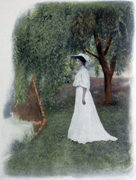 But it was not Clytie he saw; not unless the fashions have changed considerably and water-nymphs may wear with perfect propriety white shirtwaist suits and tan shoes. It was not impossible, he reasoned; for all he knew to the contrary, the July number of the Goddesses’ Home Journal—doubtless edited by Minerva—might prescribe just such garments for informal morning wear. At all events, being less bizarre than the flowing peplum of yesterday, Ethan—whose tastes in attire were quite orthodox—liked it far better. The effect was quite different, too. Yesterday she might have been Clytie; to-day reason cried out against any such possibility;[34] she was a very modern-appearing and extremely charming young lady of, apparently, twenty or twenty-one years of age, with a face, at present seen in profile, piquant rather than beautiful. The nose was small and delicate, the mouth, under a short lip, had the least bit of a pout and the chin was softly round and sensitive. This morning she wore her hair in a pompadour, while at the back the thick braids started low on her neck and coiled around and around in a perfectly delightful and absolutely puzzling fashion. Ethan liked her hair immensely. It was light brown, with coppery tones where the sunlight became entangled. She was seated on the sloping bank, her hands clasped about her knees and her gaze turned dreamily toward the cascade which sparkled and tinkled at the upper curve of the pool. As the[35] canoe had made almost no sound in its approach, she was, of course, ignorant of Ethan’s presence. And yet it may be mentioned as an interesting if unimportant fact that as he gazed at her for the space of half a minute a rosy tinge, all unobserved of him, crept into her cheeks. He laid his paddle softly across the canoe, and,——