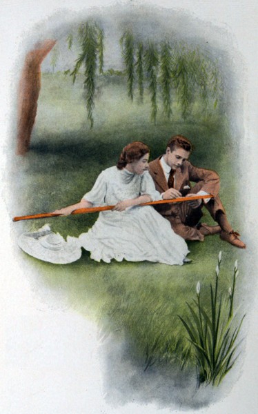 Once past the bridge and with only a single winding of the brook between him and the lotus pool, Ethan trailed his paddle for a moment while he asked himself whether he really expected to find the girl waiting for him. Of course he didn’t, only—well, there was just a chance——! Nonsense; there was not the ghost of a chance! Oh, very well; at least there was no harm in his paddling to the lotus pool—barring that he was trespassing! He smiled at that. He smiled at it several times, for some reason or other. Then he dipped his paddle again and sent the “Good Fortune” gliding swiftly over the sunlit water[33] of the pond. And when he looked there she was, seated on the bank, just as—and he realized it now—he had expected all along that she would be!