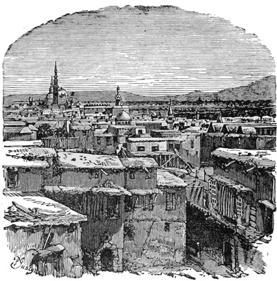 We see the Wali, or Governor, Hallett Pasha, sitting alone on a chair by the river side enjoying otium sine dignitate; his guards at a distance standing by their horses ready to look after him, if necessary. He politely returns our passing salute in true Parisian style. Like all other Turkish Pashas he will have to make hay while the sun shines and be sharp about it. His predecessor, Midhat Pasha (of mournful memory) did not enjoy the sunshine long, and Hallett’s may be a similarly short summer. It costs money to be a Damascus Pasha, some £4000 has to be first found for the Palace Cabal at Stamboul. The official pay of the appointment is under £3000 a year, so the moment a Pasha gets to his government he has to set to squeezing; he squeezes backsheesh out of the higher officials, and they squeeze the lower and the public, who are fair game for all. Justice, not at all blind here, is continually looking out for the dollars. But to return to Damascus. The plain in which it is situated is surrounded on three sides by mountains, Lebanon, Anti-Lebanon and Hermon; on the east it is bounded by the Syrian desert, in the midst of which is the city of palm trees, Palmyra, the ancient Tadmor, the city of Zenobia, the Boadicea of the Syrians. Well might the Moslem, arrived in this ever-verdant plain, after six days dreary riding across the desert, when he came across this city embosomed in beautiful gardens and 29orchards, when he saw the rills of living water flowing in all directions and rising in fountains in the very court-yards of the houses, well might he imagine that he had lighted at last upon the Garden of Eden. We find comfortable quarters at Demetri’s, the only Frank hotel, and are glad again to see some signs of western civilisation.